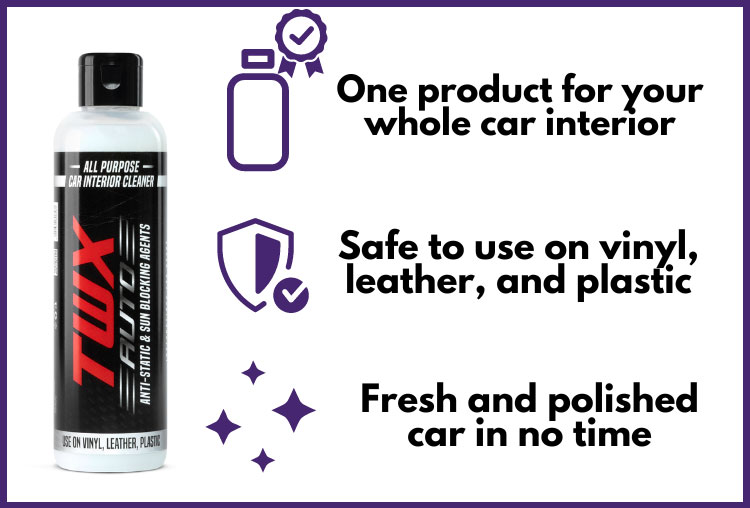 Już nie potrzebujesz 3 lub więcej różnych środków czyszczących zaśmiecających garaż, aby Twój samochód lśnił czystością - TWX® Auto Interior Uniwersalny środek do czyszczenia wnętrza samochodu to wszystko, czego potrzebujesz. Ten produkt sprawi, że wnętrze Twojego samochodu będzie wyglądało świetnie na dłużej. Nie pozostawia tłustej ani mglistej powłoki - jedynie czyste, matowe wykończenie. Nasz środek czyszczący zawiera również środki blokujące promieniowanie słoneczne, które chronią wnętrze przed szkodliwym działaniem promieni UV, dzięki czemu wnętrze wygląda na nowe o wiele dłużej.